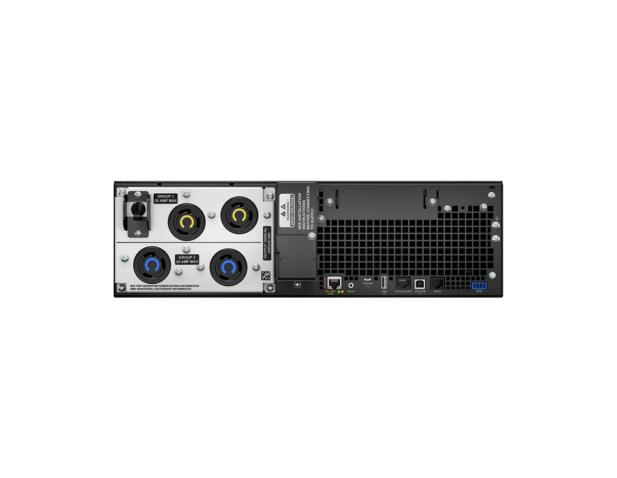 This model includes two NEMA L6-20R and two NEMA L6-30R outlets, with an L6-30P input plug. Equipped with a pre-installed network management card and SmartSlot support, it offers advanced remote monitoring and control. The extended runtime capability makes it ideal for scalable power protection in data centers and network environments.