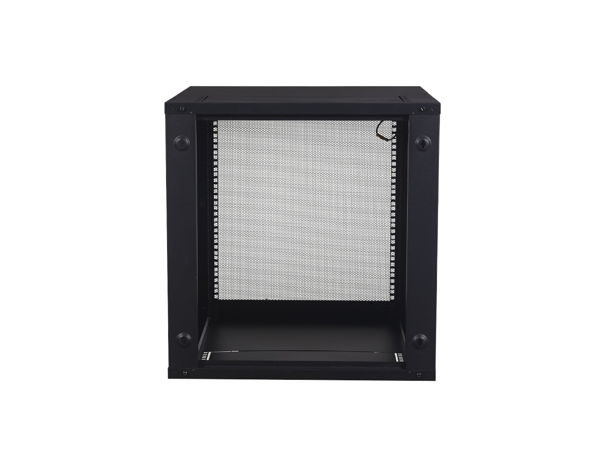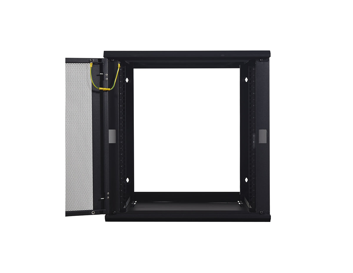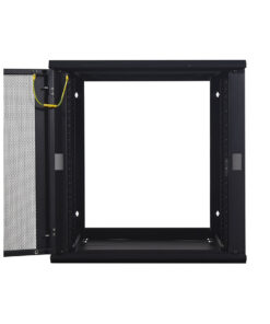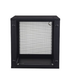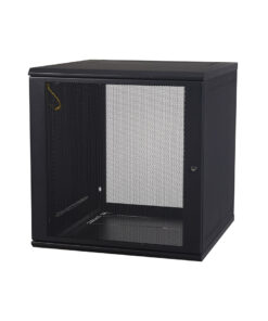 The wall-mounted design includes integrated cable management to keep installations organized and neat. Optional accessories like fan trays and caster kits further enhance functionality. This cabinet meets EIA-310E compliance, ensuring reliable performance.