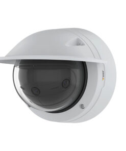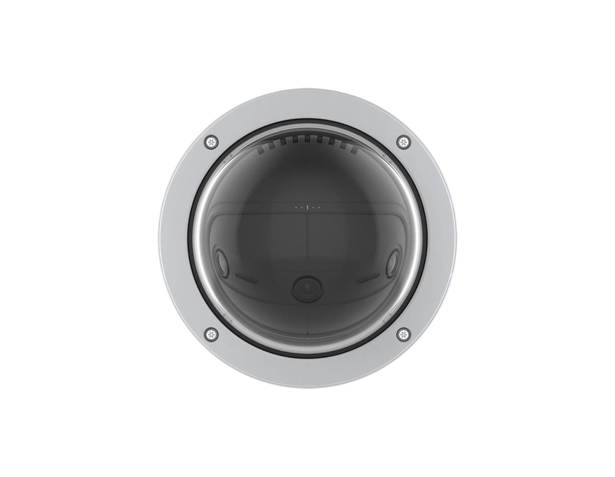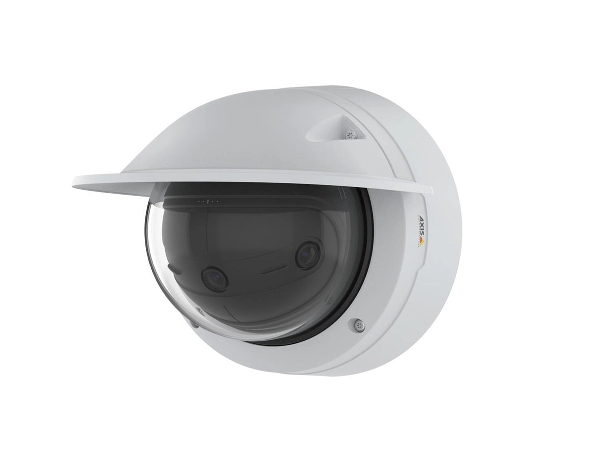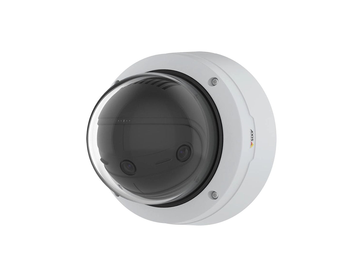 This camera has 13 megapixels and features multiple sensors. It is called the P3818-PVE camera and provides 180° horizontal coverage and 90° vertical coverage without any blind spots. Users can also mount two of these cameras back-to-back using the Axis T94V01C Dual Camera mount, which allows for a more comprehensive situational awareness over larger areas and distances. The P3818-PVE camera provides seamless stitching across all three images, resulting in a single, smooth video stream with a coherent-looking image.