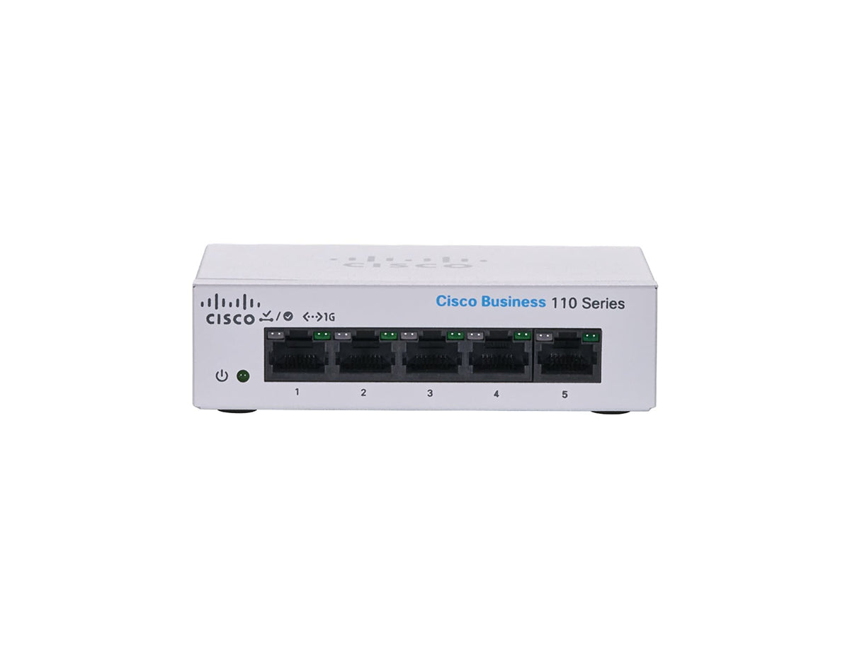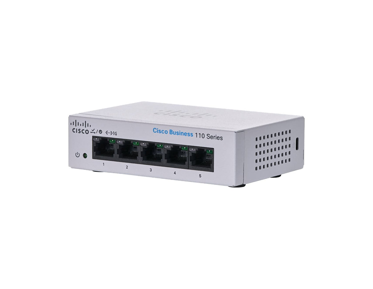 The Cisco CBS110-5T-D is a compact 5-port Gigabit Ethernet switch designed to provide fast and reliable networking for small businesses. With its plug-and-play functionality, this switch simplifies the deployment of network devices such as computers, printers, and IP phones, requiring no configuration. Its fanless design makes it ideal for office environments, offering quiet and energy-efficient operation.