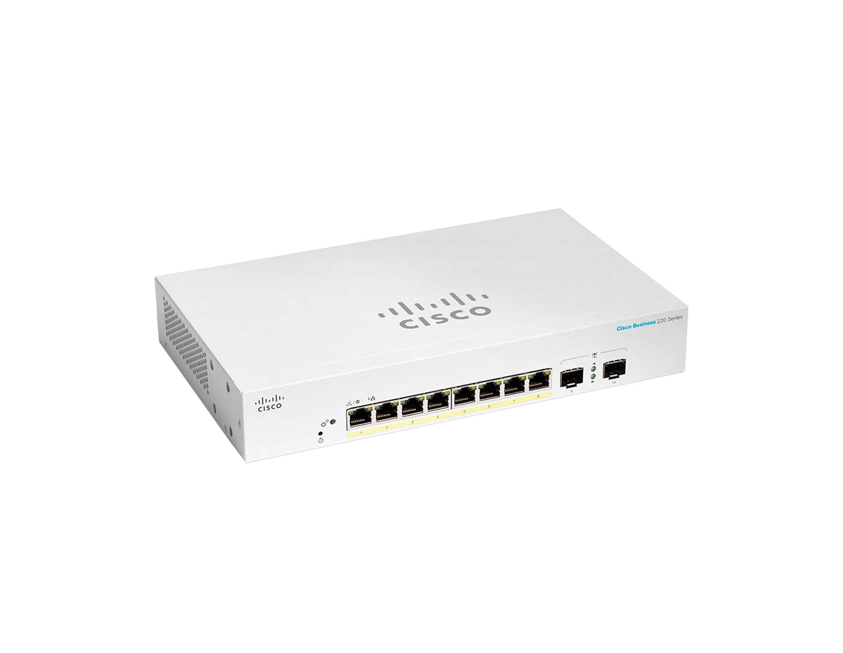 The Cisco CBS220-8FP-E-2G is an 8-port Gigabit Ethernet switch with Power over Ethernet (PoE) capabilities, designed to offer reliable networking for small businesses. With 8 PoE ports and 2 Gigabit SFP uplinks, this smart-managed switch is ideal for deploying and powering devices like IP phones, security cameras, and wireless access points. With a PoE budget of 120W, it provides power and connectivity through a single cable, simplifying network deployments.