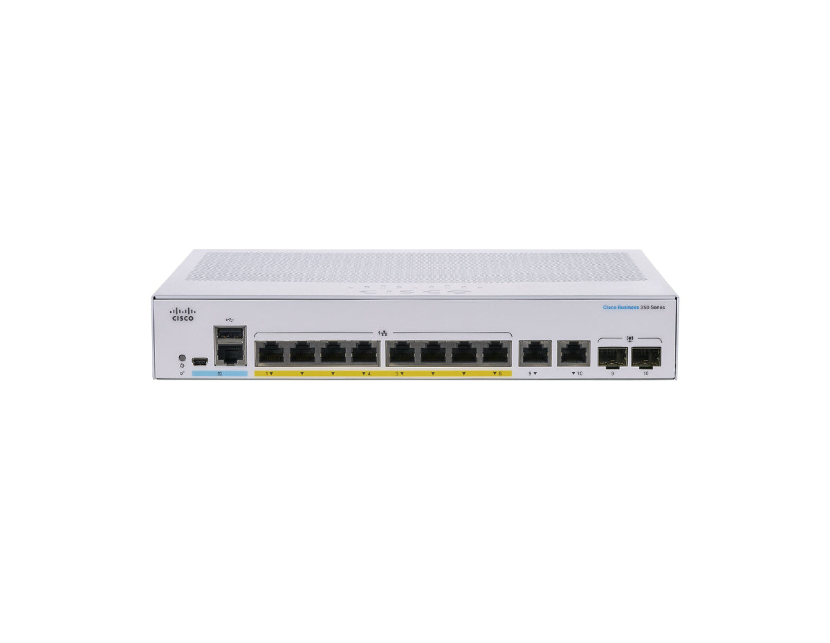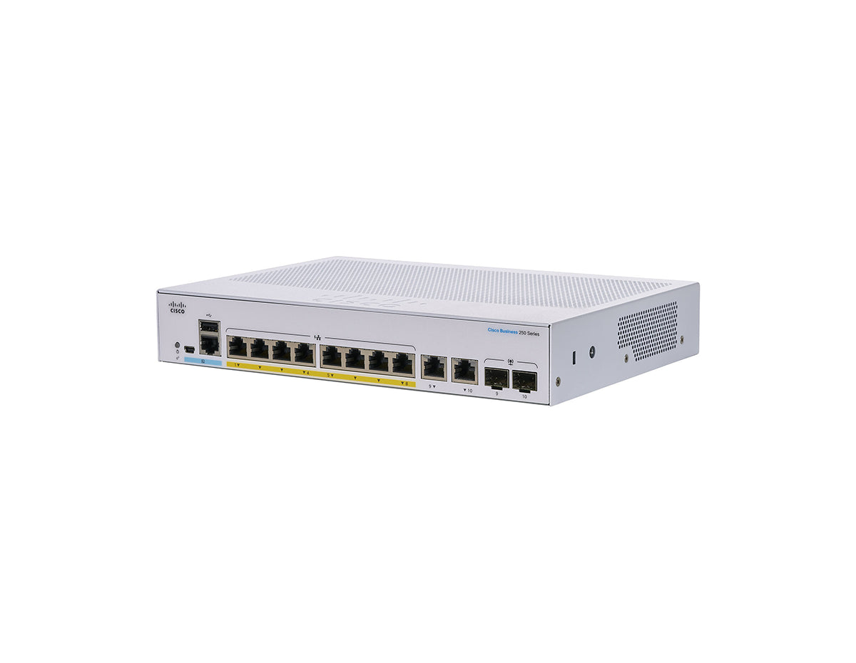 The Cisco CBS250-8FP-E-2G is a reliable managed switch that provides flexible network management and Power over Ethernet (PoE) capabilities, making it an ideal solution for small businesses. With 8 Gigabit Ethernet PoE+ ports and 2 combo Gigabit Ethernet/SFP uplink ports, the switch delivers a total PoE power budget of 120W, making it suitable for powering IP phones, cameras, and access points.