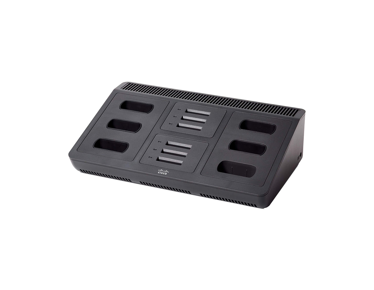 The Cisco CP-MCHGR-8821-BUN charging can charge up to six phones and six spare batteries at the same time. The phone can be charged without removing a protective case. You can place the multi-charger on a work surface or mount it on a wall.