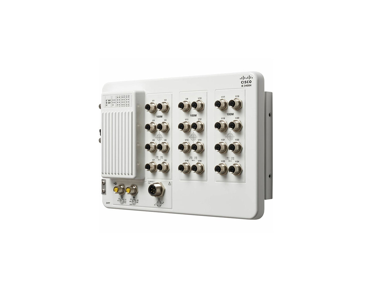 The Cisco IE-3400H-24FT-E is a rugged industrial Ethernet switch designed to provide reliable and secure network connectivity in harsh environments. This switch features 24 Fast Ethernet ports and advanced Layer 2 and Layer 3 management capabilities, making it an ideal solution for connecting critical industrial devices such as sensors, controllers, and automation systems. The IE-3400H-24FT-E is engineered to operate under extreme conditions, ensuring continuous operation while offering robust network security and traffic management features.