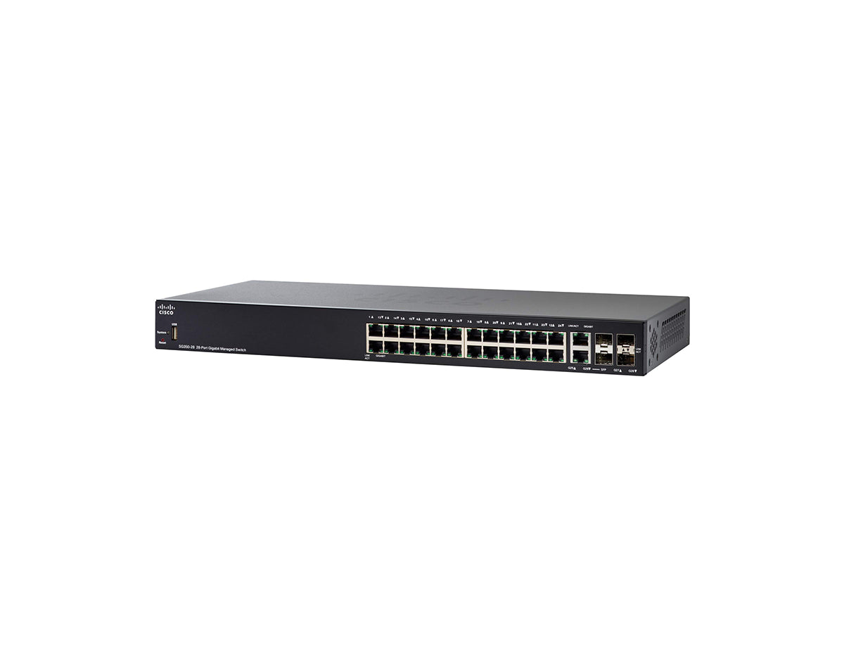The Cisco SG350-28-K9 is a managed switch designed for businesses requiring a reliable and scalable network. With 24 Gigabit Ethernet ports and 4 additional Gigabit combo ports (2 copper/SFP combo and 2 SFP ports), this switch offers robust performance, advanced security, and flexible management capabilities. Ideal for growing businesses, the SG350-28-K9 ensures a high level of connectivity with advanced Layer 3 traffic management.