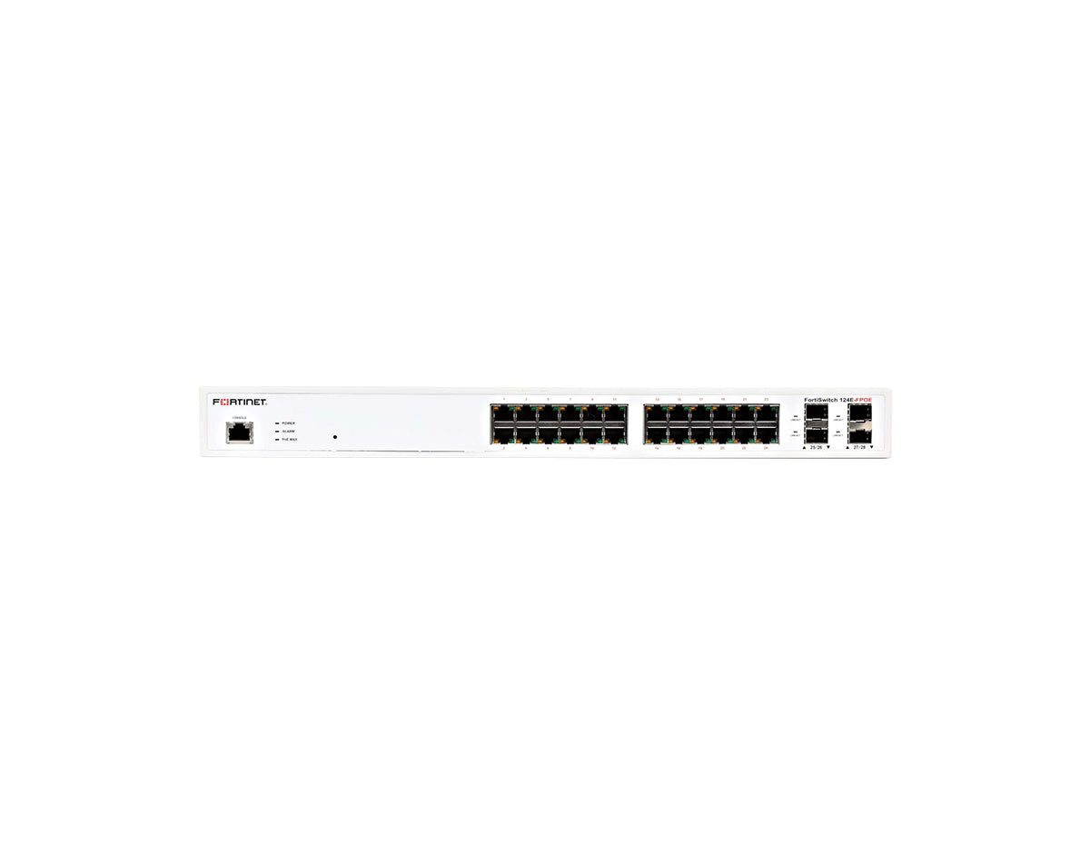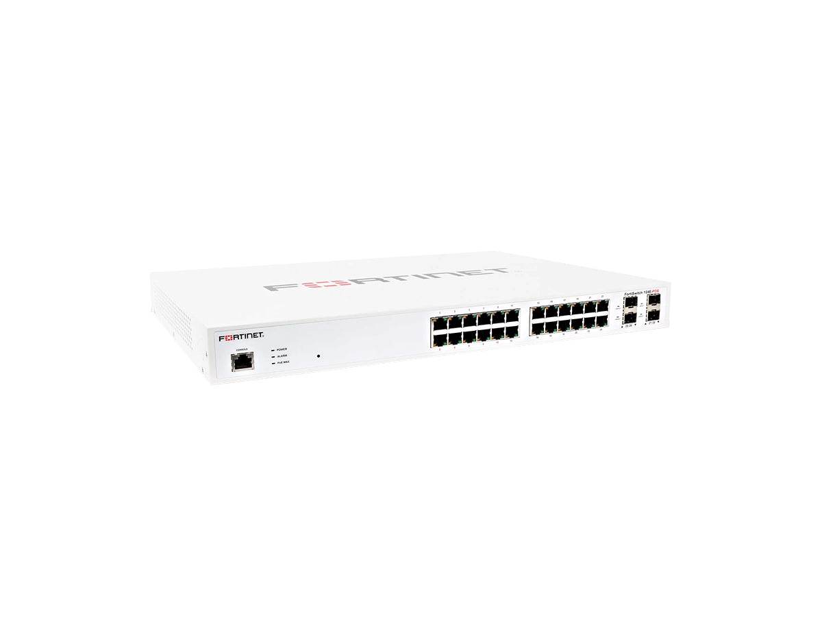 The Fortinet FS-124E-POE is a member of the FortiSwitch family. The FS-124E-POE is an effective and uncomplicated Ethernet solution that offers excellent performance. It is well-suited for small to medium businesses that prioritize security. The device can be easily managed through the familiar FortiGate interface, providing a user-friendly and comprehensive monitoring platform, and controlling network users and devices. This product has 24x GE RJ45 ports, 4x GE SFP ports, 12 PoE ports, and 256MB DDR3 RAM.