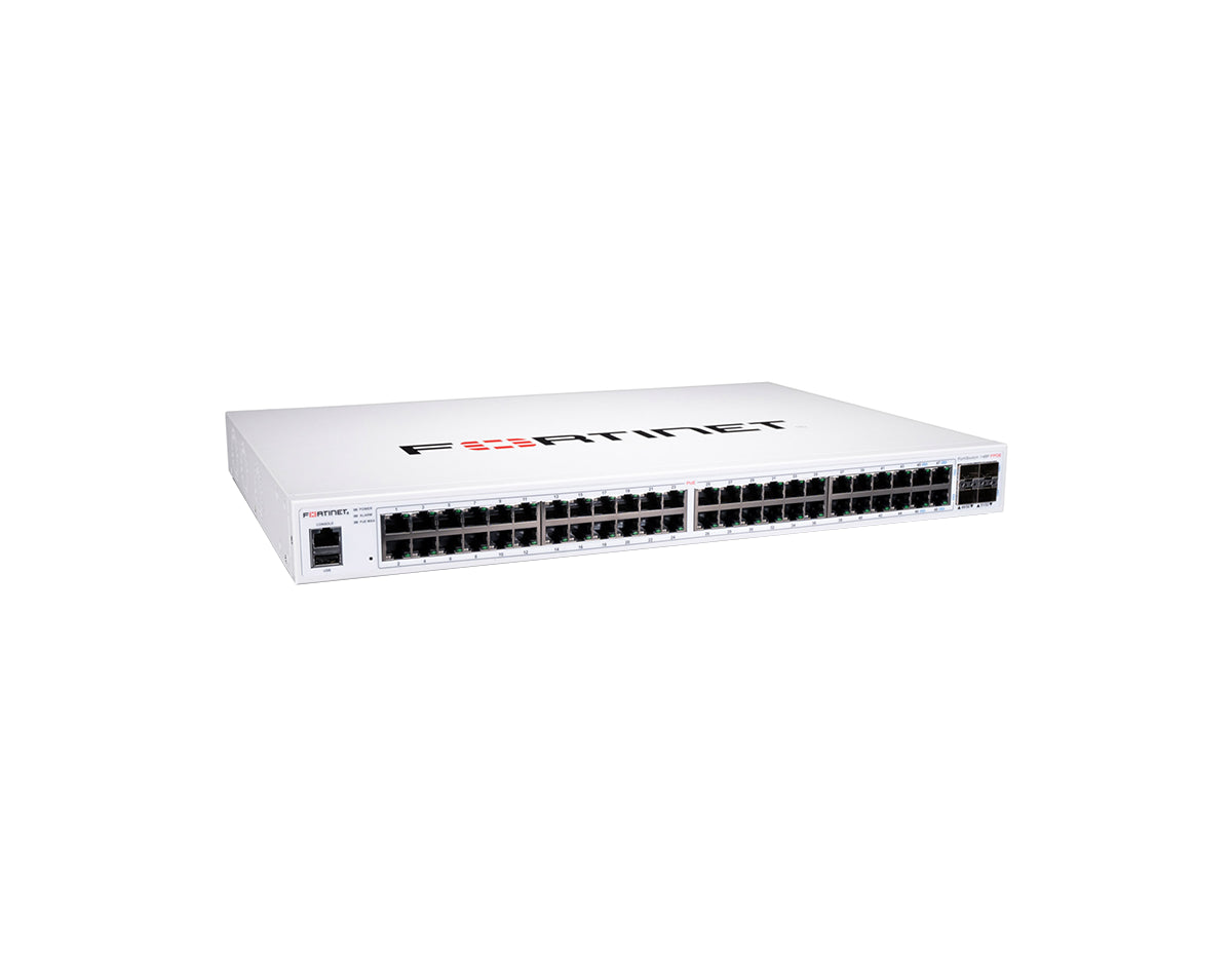 FortiSwitch-148F-FPOE is a performance/price competitive L2+ management switch with 48x GE port + 4x SFP+ port + 1x RJ45 console. Port 1- 48 are POE ports with automatic Max 740W POE output limit (48 port 802.3af or 24 port 802.3at)