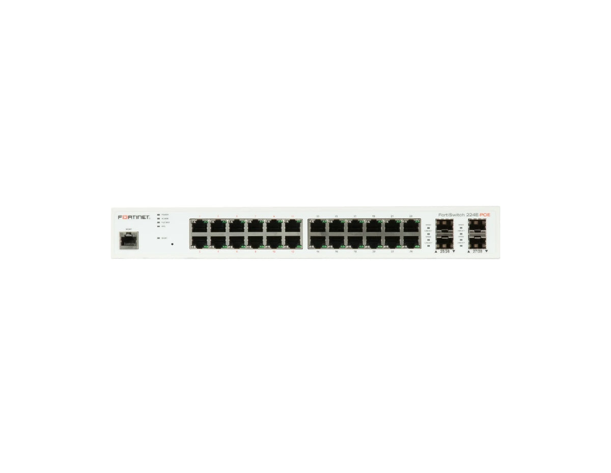 Layer 2/3 FortiGate switch controller compatible PoE+ switch with 24 x GE RJ45 ports, 4 x GE SFP, with automatic Max 180W POE output limit