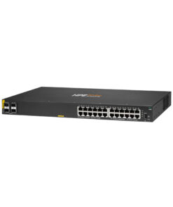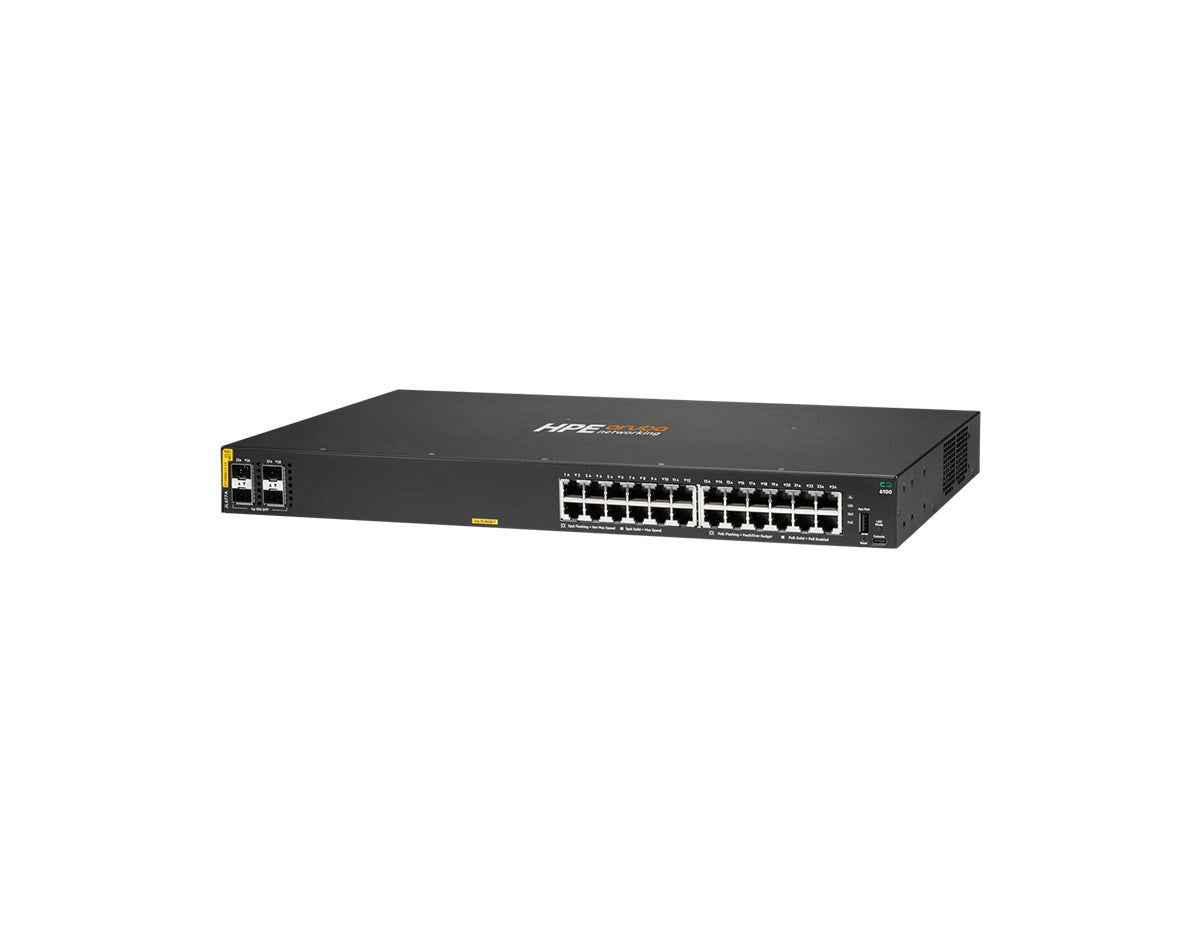 The HPE Aruba 6100 24G Class4 PoE 4SFP+ 370W Switch delivers reliable, high-performance networking with Power over Ethernet (PoE) support for small to medium-sized businesses. With 24 Gigabit Ethernet PoE ports, this switch provides up to 30W per port, ideal for powering IP phones, cameras, and access points. It also features 4 SFP+ uplinks for scalable 10GbE connectivity and a 370W PoE power budget, making it a robust choice for growing networks.