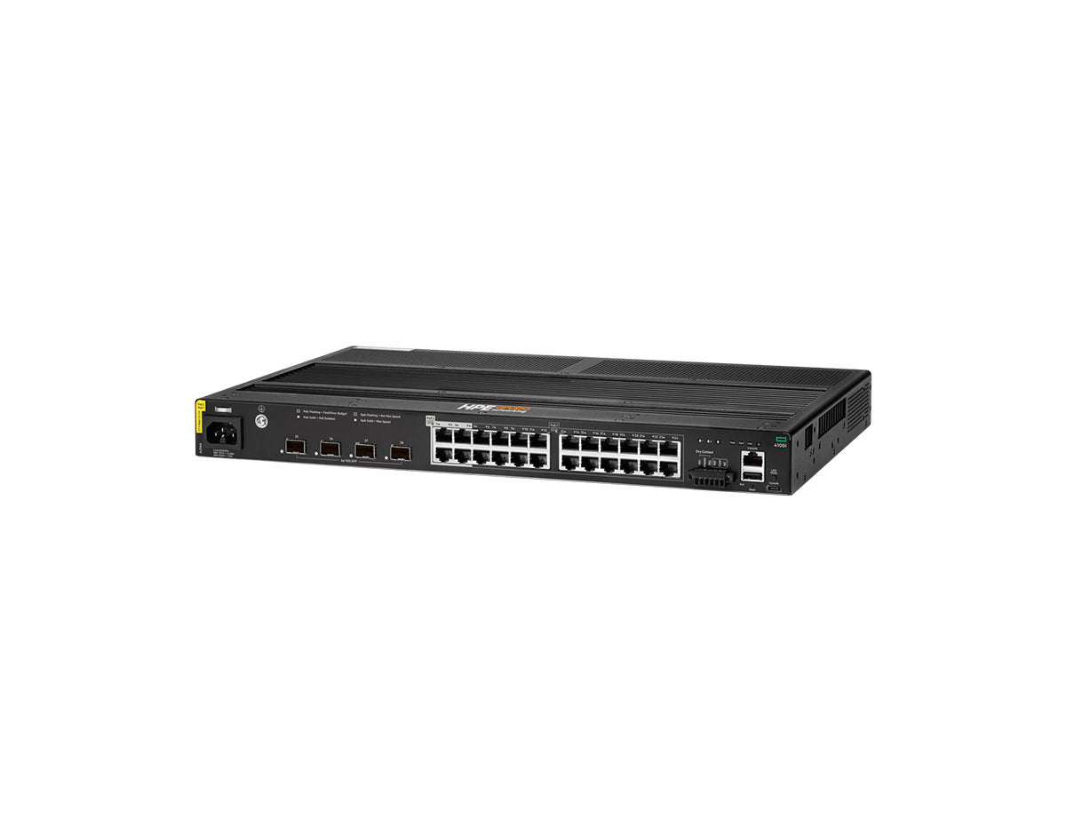 The HPE Aruba Networking 4100i 24-port Switch (JL818A) is built to meet the networking needs of industrial environments. This rugged switch supports 20 Class 4 PoE ports and 4 Class 6 PoE ports, providing the power necessary for a wide range of IoT devices and industrial equipment. Additionally, it includes 4 SFP+ uplink ports for high-speed 1/10GbE connectivity. Its fanless design, along with support for extreme temperatures and rugged conditions, makes it ideal for outdoor deployments, smart cities, and industrial automation.