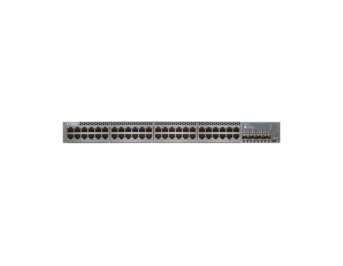 The EX3400-48P is an ideal choice for campus wiring closet deployments equipped with Power over Ethernet (PoE). Featuring 48 PoE+ ports delivering up to 30 watts per port, this switch supports devices such as IP phones, wireless access points, and cameras. The EX3400-48P supports Virtual Chassis technology, which allows the interconnection of up to 10 switches and the management of them as a single unit.