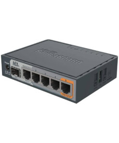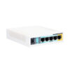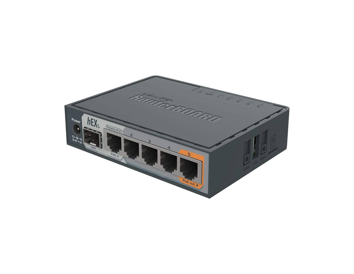 The RB760iGS is a router with five Gigabit Ethernet ports designed for use in environments where wireless connectivity is unnecessary. The product is cost-effective, compact, and user-friendly, while also featuring a robust dual core 880 MHz CPU and 256 MB RAM, enabling advanced configurations supported by RouterOS. Additionally, it includes a USB 2.0 port, PoE output for Ethernet port5, and a 1.25Gbit/s SFP cage. Port5 has the capability to power other passive PoE capable devices with the same voltage as applied to the unit.