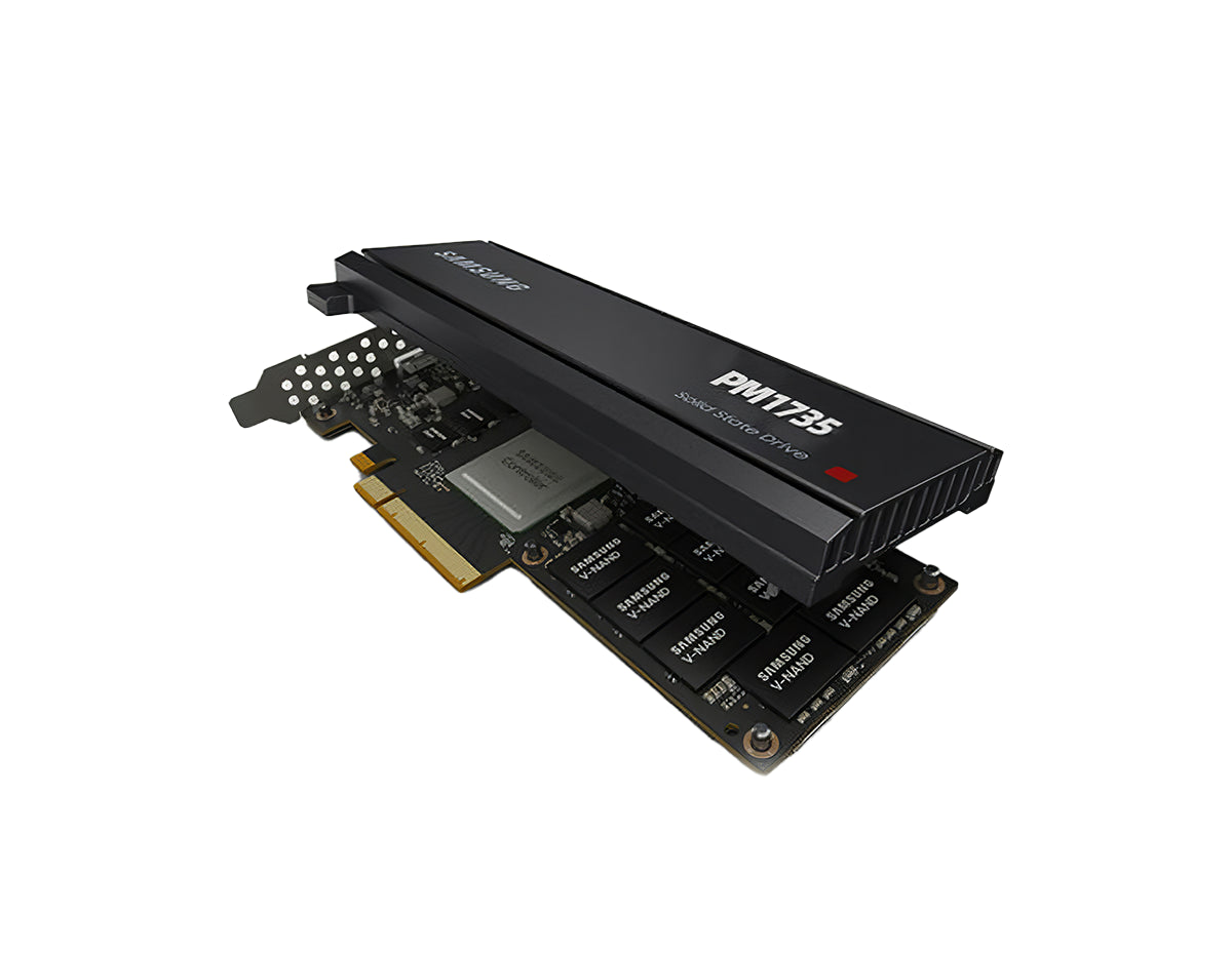 Samsung’s PM1735 SSD drives are high-performance NVMe PCIe storage solutions with capacities up to 12.8TB. It offers low-cost solutions for institutions with its high performance and durability and design structure that supports a wider range of workloads. The PM1735 features PCIe 4.0 interface (16Gbps per lane) and NVMe protocol to deliver exceptional performance and has 6.4 TB storage capacity. It has a sequential read speed of 8 GB/s and a sequential write speed of 3.8 GB/s. It has a latency of 100 µs(microsecond) and a value of 1,500,000 IOPS in a random 4KB read, and a latency of 25 μs and 250,000 IOPS in a random 4KB write.