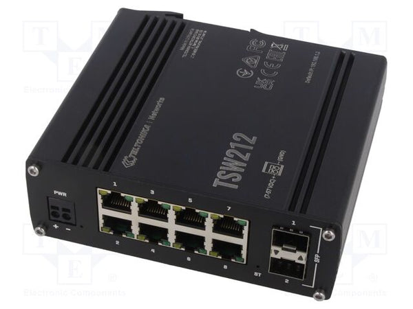 The Teltonika TSW212 is a Layer 2 managed Ethernet switch with 8 Gigabit Ethernet ports and 2 SFP ports for fiber communication. It features IPv6 support, industrial protocol compatibility, and robust performance in harsh environments, making it ideal for industrial and networking applications.
