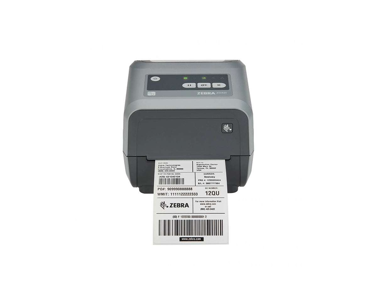 Zebra ZD4A043-301E00EZ (ZD421) is a high-resolution thermal transfer barcode label printer, featuring 300 dpi resolution, 4.02 ips print speed, and multiple connectivity options including USB, USB Host, and Ethernet